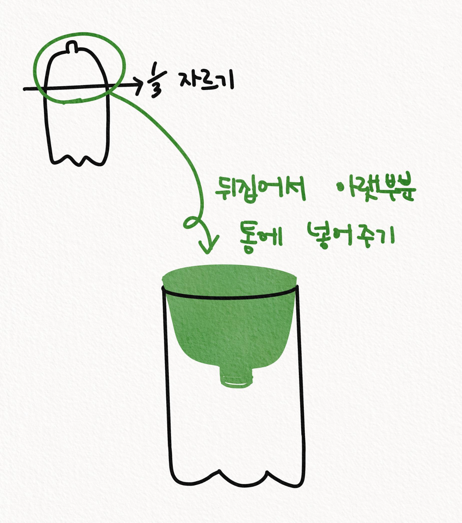 우선 2리터 페트병을 위에서부터 3분의 1 위치까지 수평하게 잘라줍니다. 잘라낸 입구 부분을 거꾸로 뒤집어서 아랫부분에 위의 그림과 같이 넣어줍니다.