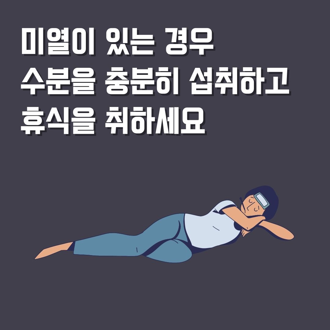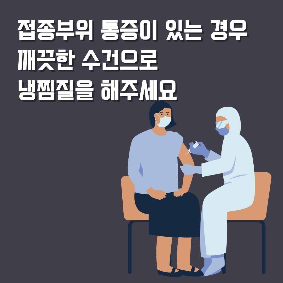 접종 부위에 통증이 있는 경우에는 깨끗한 수건으로 냉찜질을 해 주시는 것이 도움이 됩니다. 그리고 미열이 있는 경우에는 수분을 충분히 섭취하고 휴식을 취해 주세요. 무엇보다 접종 후 충분히 휴식을 취하는 것이 도움이 됩니다.