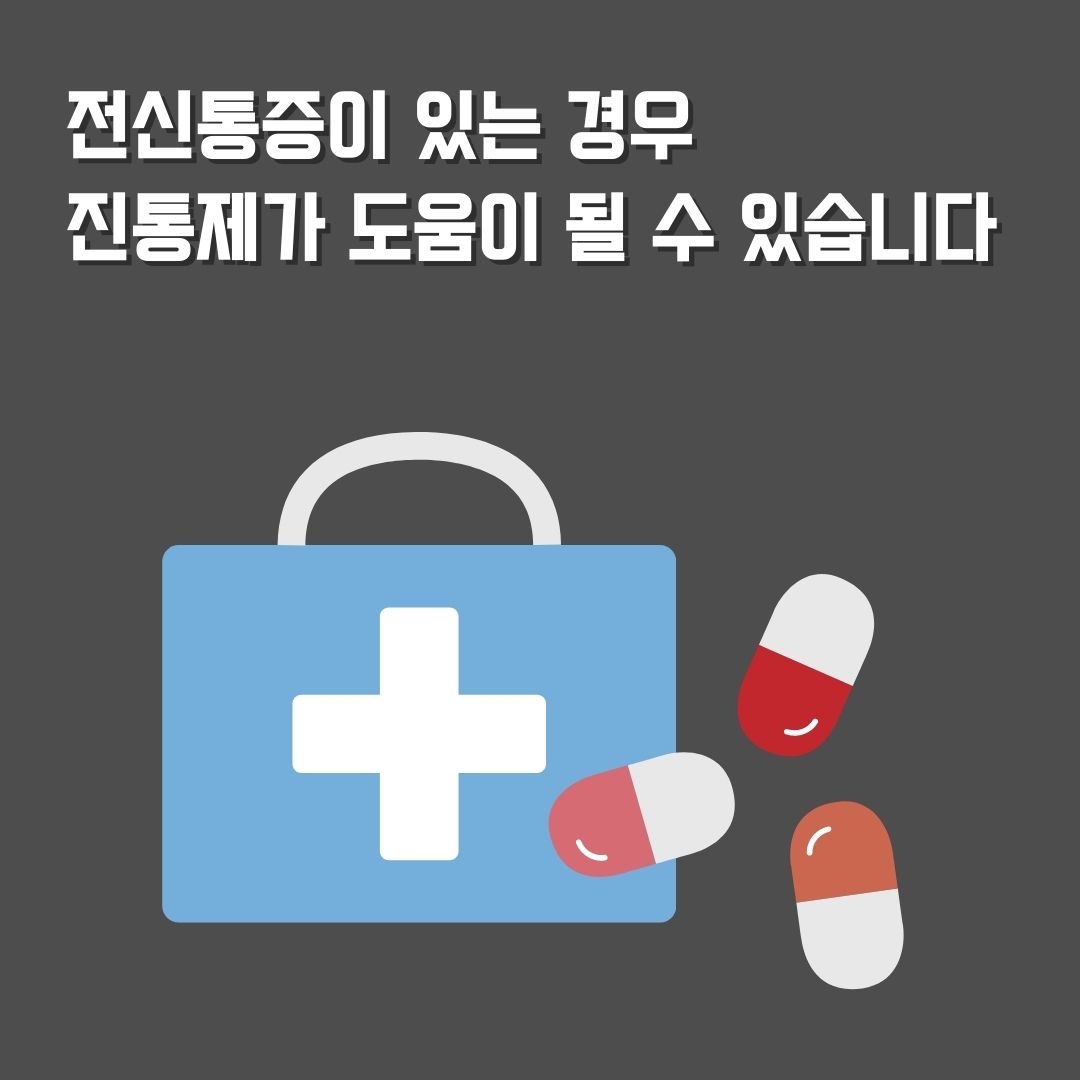 그리고 전신에 통증이 있는 경우에는 진통제가 도움이 될 수 있습니다. 약국이 많지 않은 작은 동네에서는 진통제가 품절이 되는 경우도 있다고 하니, 미리 집에 한 통 구비 해 놓는 것도 도움이 될 것입니다.