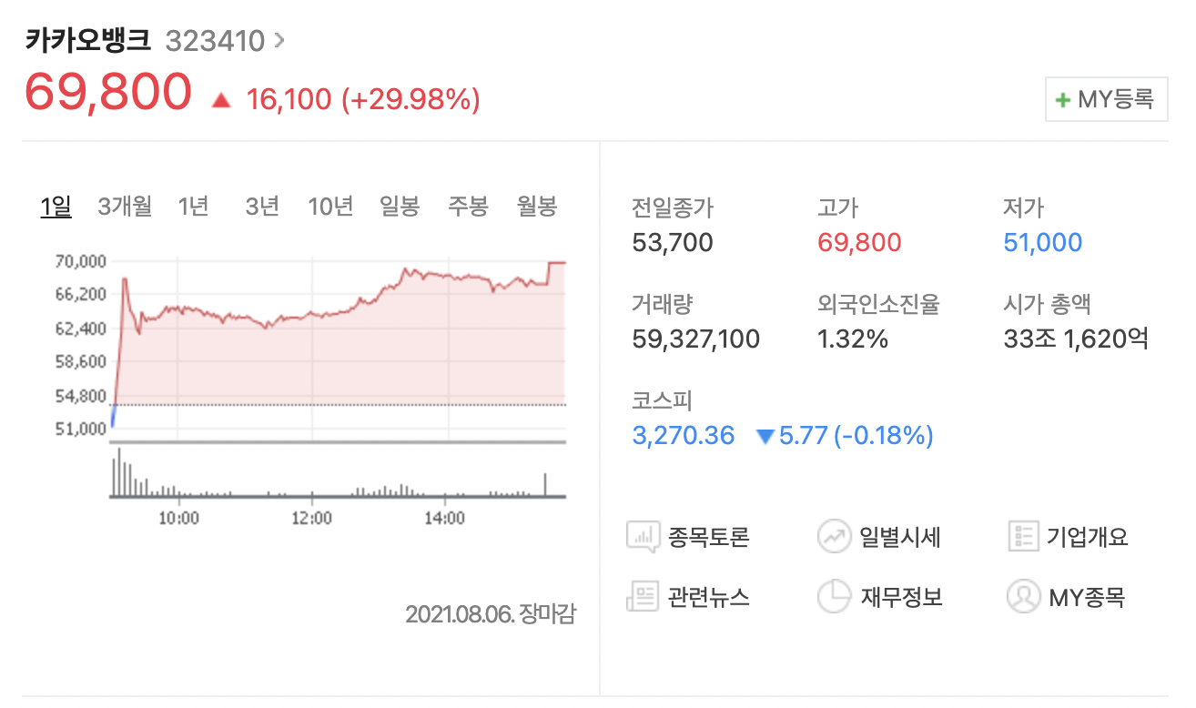 공모 청약 과정에서 58조원의 증거금을 모으며 주목을 모았던 카카오 뱅크가 오늘 드디어 코스피 시장에 상장하게 되었습니다. 시초가를 공모가의 2배 이상 형성하지 못하며 따상에는 실패했지만 매수세가 몰리면서 20%대에 달하는 급등세를 보이며 주식 시장에 힘을 나타내 보이고 있습니다. 덩달아 카카오 관련 주식들에게도 힘을 실어주게 되었습니다. 그리고 오늘 상한가로 마감하며 좋은 출발을 시작하였습니다.