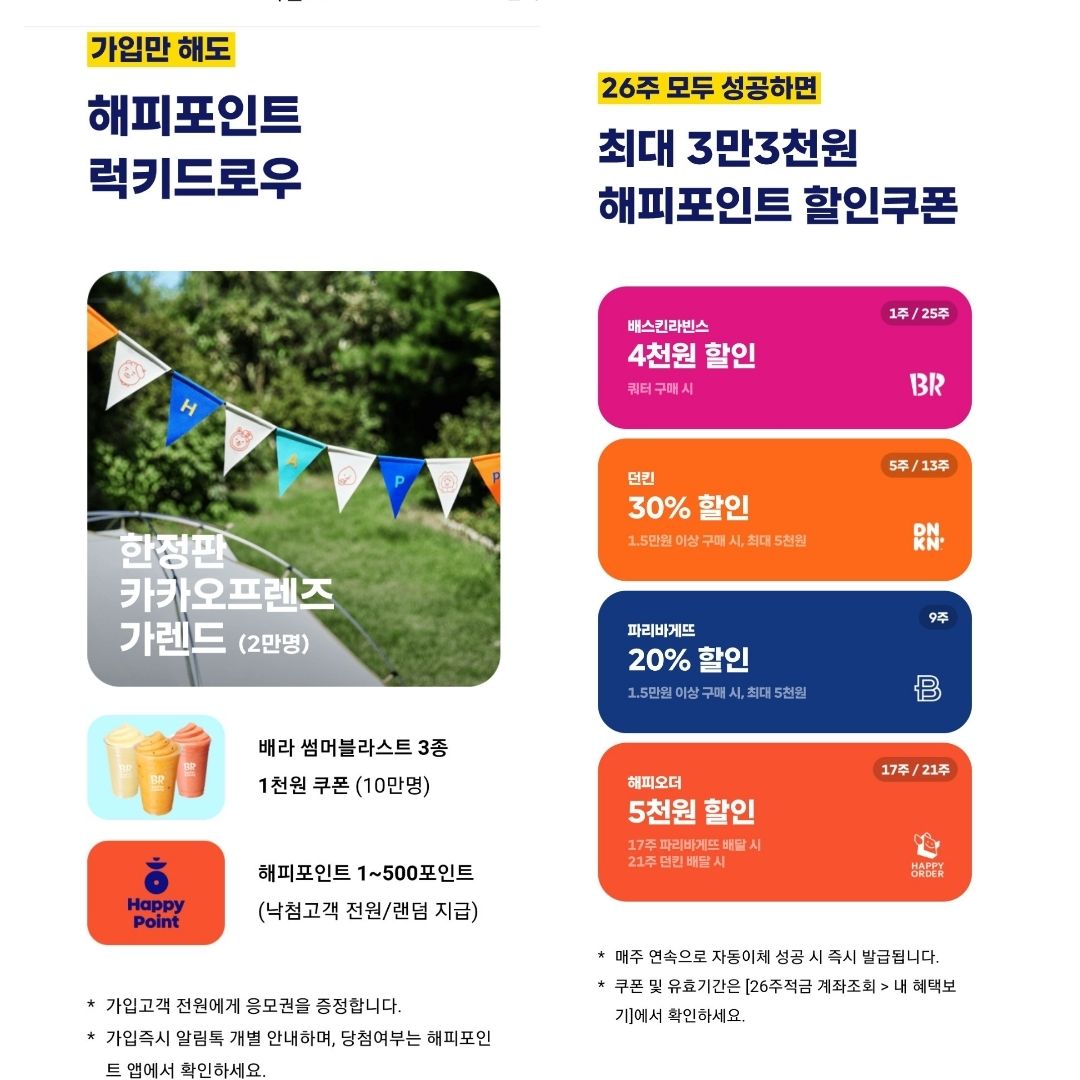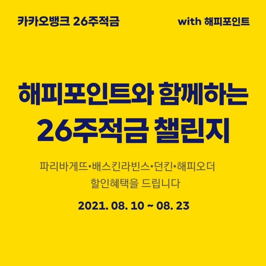 이번에는 카카오뱅크가 SPC그룹의 해피포인트와 손잡고 26주적금with해피포인트를 출시하였습니다. 이번에는 해피포인트와 함께 SPC그룹이 운영하는 파리바게트, 베스킨라빈스, 던킨, 해피오더 등에서 사용할 수 있는 할인쿠폰과 혜택을 주는 상품인 것입니다. 적금 계좌를 개설하고 매주 연속으로 자동이체 납입에 성공하면, 총 7회에 걸쳐 최대 3만 3천원의 해피포인트 할인 쿠폰을 제공한다고 하니 적금도 넣고 베스킨에서 아이스크림도 먹고 1석2조의 혜택을 누릴 수 있을 것 같아 마음에 들었습니다.
