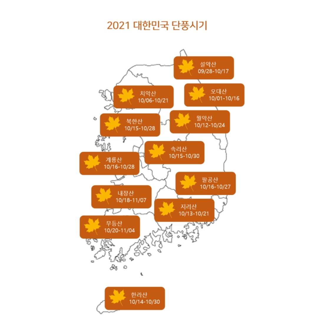 첫 번째 2021년 가을 단풍시기는 설악산의 9월 28일을 시작으로 마지막인 10월 21일 무등산에서 단풍이 절정일 예정이라고 합니다. 전국 단풍명소를 산 별로 살펴보면 오대산이 10월 1일이고, 치악산 10월 10일, 월악산 10월 14일, 계룡산과 팔곳ㅇ산이 10월 18일으로 보입니다.