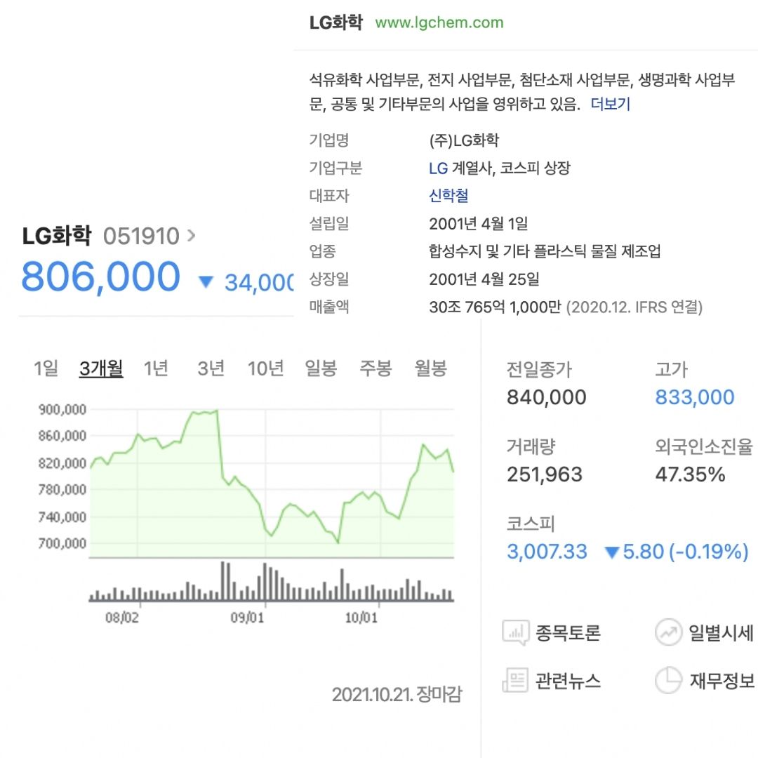 2020년 가장 핫했던 2차 전지 테마 대장주인 LG화학입니다. 석유화학과 전지사업이며 최근에 전기차 시장의 성장과 함께 꾸준히 주목받고 있는 주식이기도 합니다.