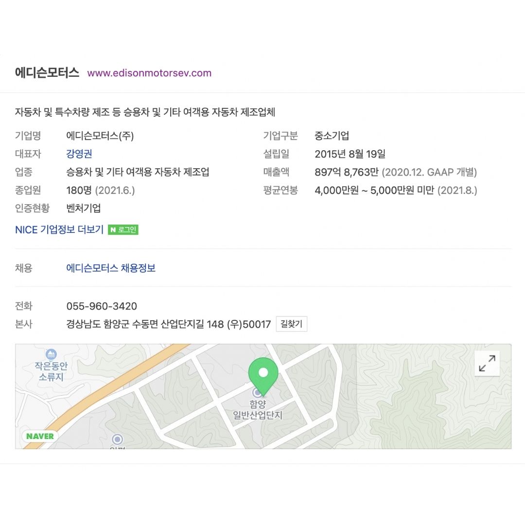 테슬라를 뛰어넘는 전기자동차 제작사가 되겠다는 뜻으로 에디슨 모터스라고 이름을 지었다고 하며, 앞으로도 전기 승용차를 개발하겠다는 의지를 보이고 있습니다. 에너지솔루션즈가 지분을 92.83% 보유한 비상장기업이며, 쎄미시스코가 전기차 사업 확장을 위하여 에디슨모터스 지분 7%를 인수한 바 있습니다.